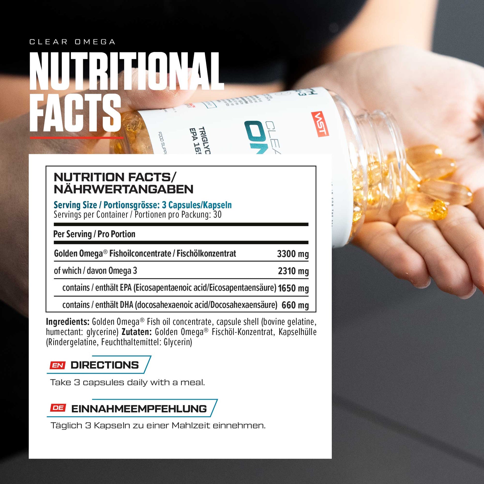 - CLEAN & STRONG Per 3 softgels: 3300mg of Golden Omega® fish oil, providing 2320mg Omega-3, 1660mg EPA, and 660mg DHA.