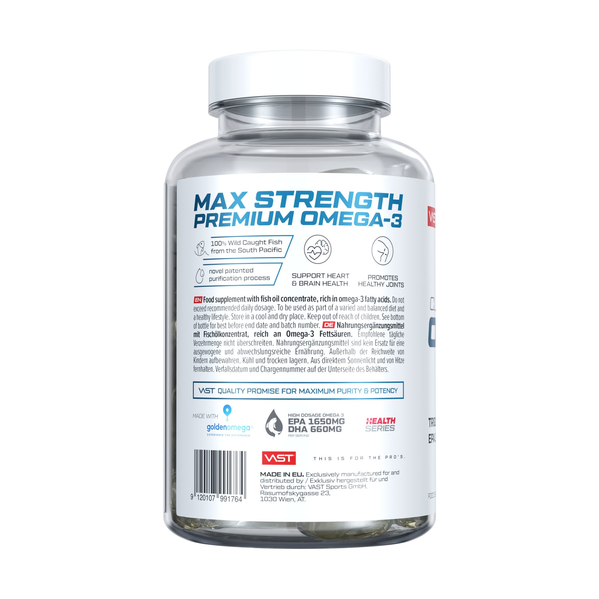 While most fish oils come from industrially farmed fish that swim in their own wastewater and contain high levels of heavy metals, VAST Clear Omega is made from Golden Omega® fish oil.