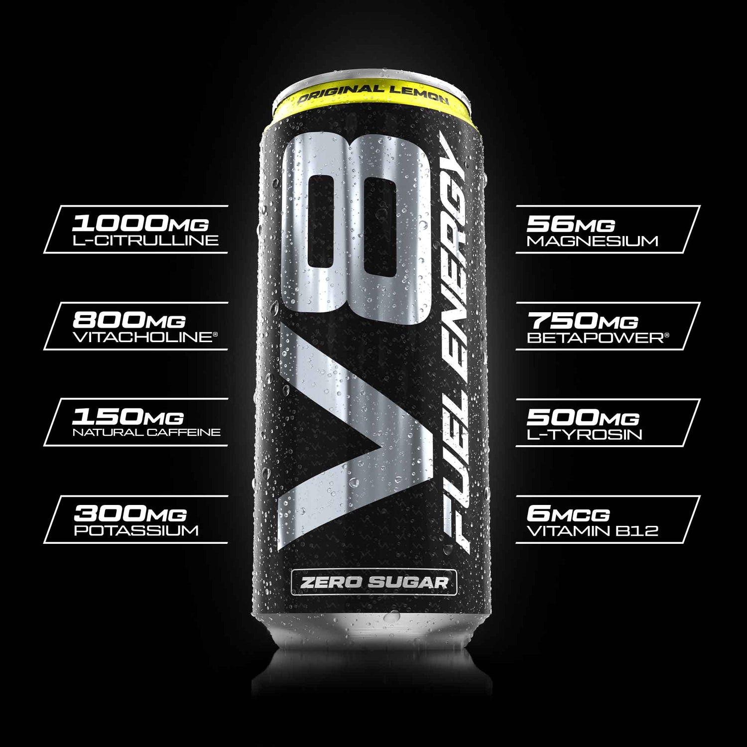 Ingredients: Water, carbon dioxide, acidity regulators (citric acid, malic acid), L-Citrulline, choline bitartrate (VitaCholine®), potassium citrate, anhydrous betaine (BetaPower®), flavors, L-Tyrosine, magnesium citrate, coloring (anthocyanin), natural caffeine, sweeteners (sucralose, stevia extract (Reb A 97%)), pink Himalayan salt, vitamin B12 (methylcobalamin).