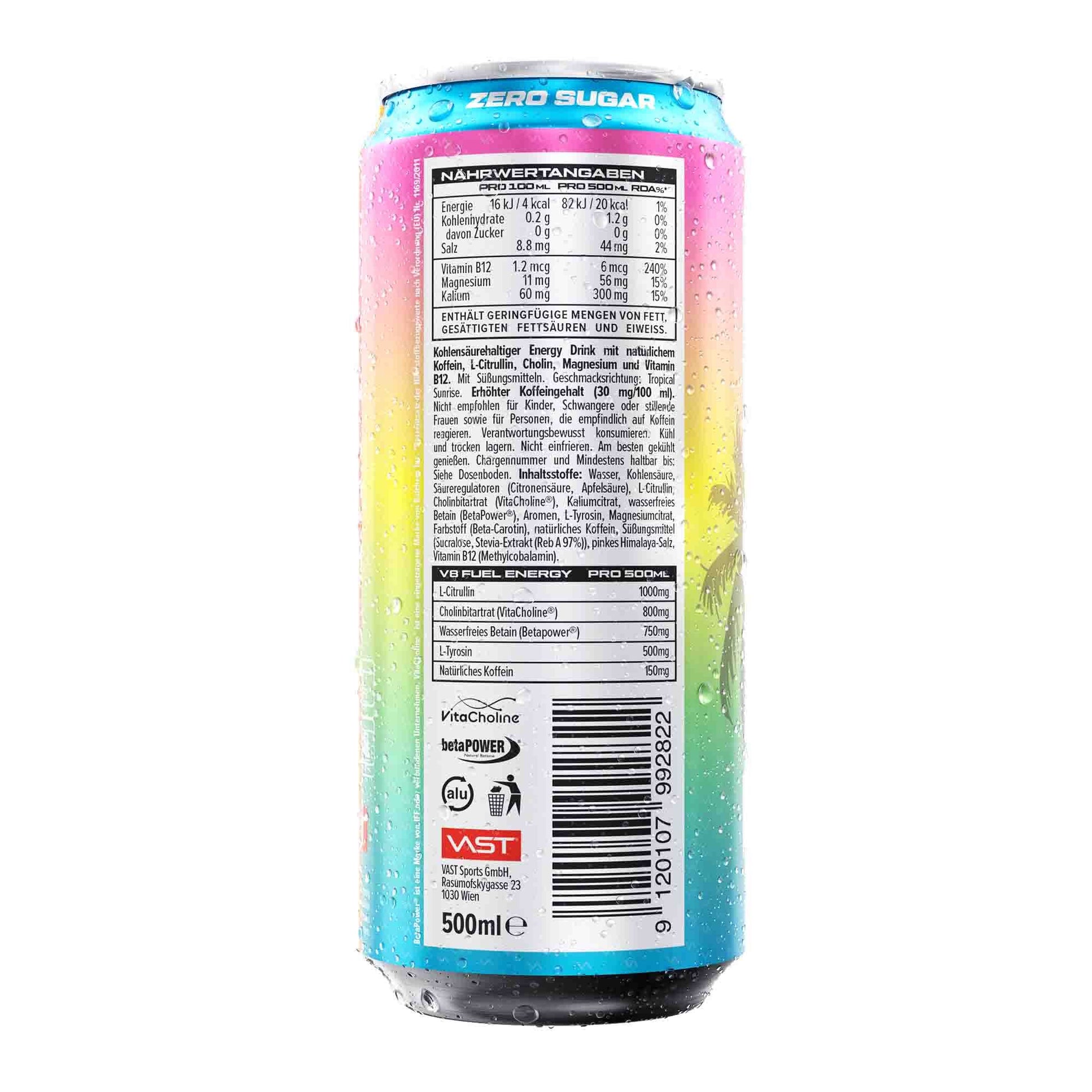 Inhaltsstoffe: Wasser, Kohlensäure, Säureregulatoren (Citronensäure, Apfelsäure), L-Citrullin, Cholinbitartrat (VitaCholine®), Kaliumcitrat, wasserfreies Betain (BetaPower®), Aromen, L-Tyrosin, Magnesiumcitrat, Farbstoff (Beta-Carotin), natürliches Koffein, Süßungsmittel (Sucralose, Stevia-Extrakt (Reb A 97%)), pinkes Himalaya-Salz, Vitamin B12 (Methylcobalamin).